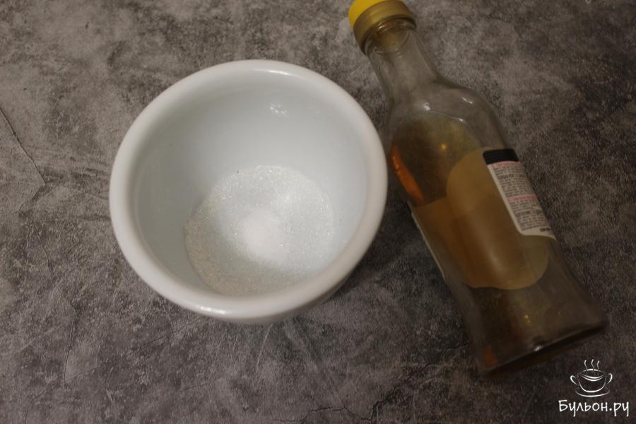 2. В пиале смешайте рисовый уксус, сахар и соль. На паровой бане прогрейте уксус, чтобы сыпучие ингредиенты растворились.