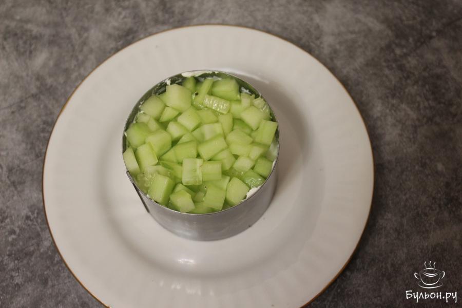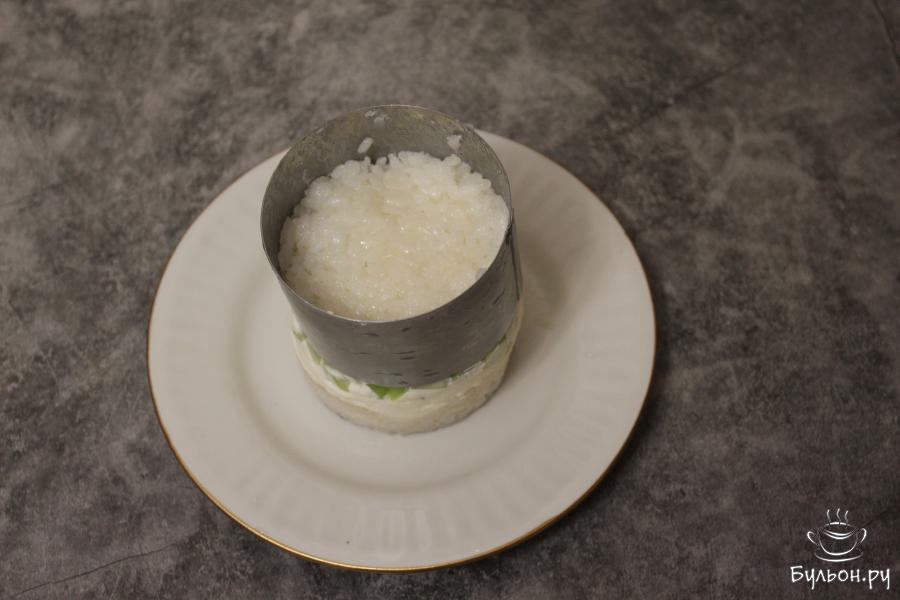 6. Поверх риса выложите ровным слоем творожно-сливочный сыр. На сыр выложите огурец, очищенный от кожуры и нарезанный небольшими кубиками.