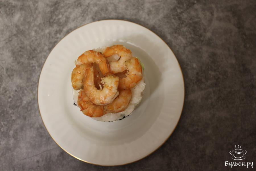 8. Аккуратно извлеките кольцо, а поверх выложите креветки. При подаче на стол подайте к салату соевый соус.