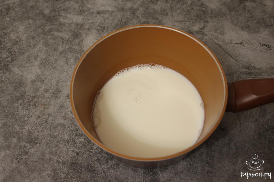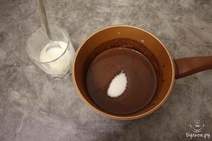 4. В ковшик добавьте сахар, соль и молоко с крахмалом. Постоянно помешивая венчиком, чтобы крахмал не прилип ко дну ковшика, готовьте шоколад на плите до загустения.
