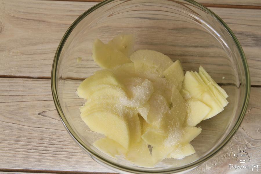 6. Яблочные дольки переложить в чашу и присыпать 3 столовые ложки сахарного песка. Хорошо перемешать.