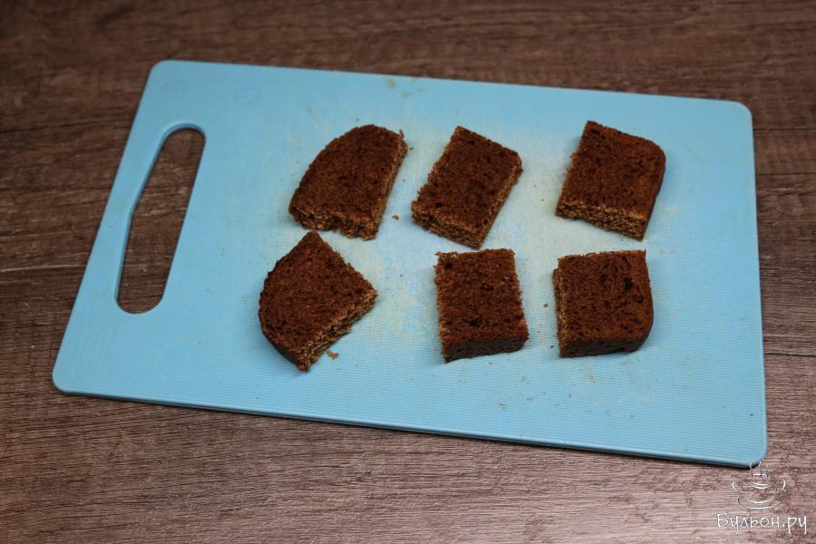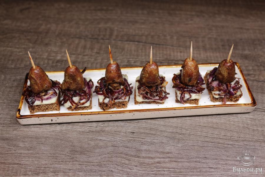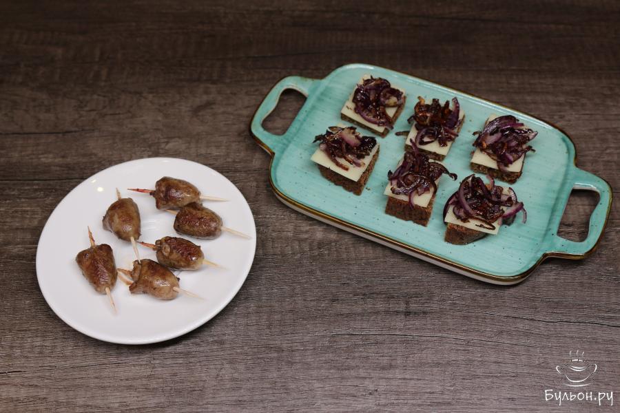 5. Хлебные кусочки выложите на керамическую поверхность. Положите сыр на хлеб. Сверху положите жареный лук. На зубочистки насадите по куриному желудочку и воткните в кусочки хлеба с другими ингредиентами.
