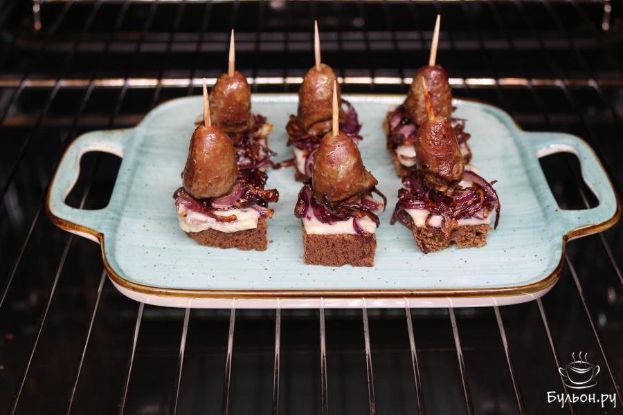 6. Канапе поставьте в духовку, при 180 градусах, буквально на 5 минут. Как только сыр поплавится, достаньте канапе из духовки.
