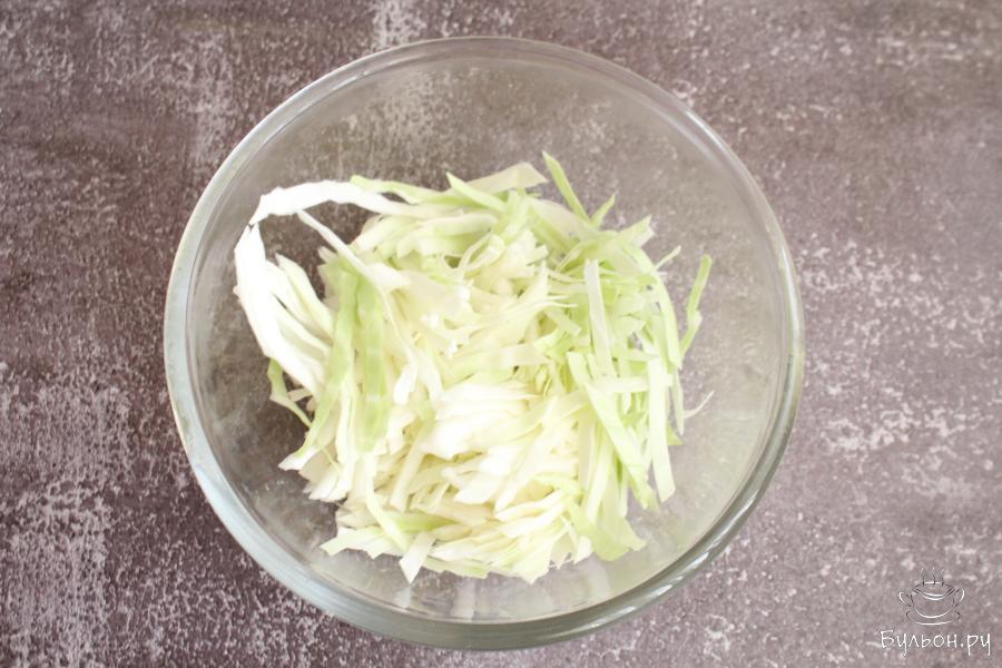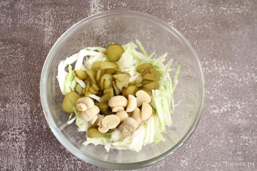 2. Маринованные огурцы нарезать полукружочками, маринованные грибы - на половинки. Добавить в миску с капустой.