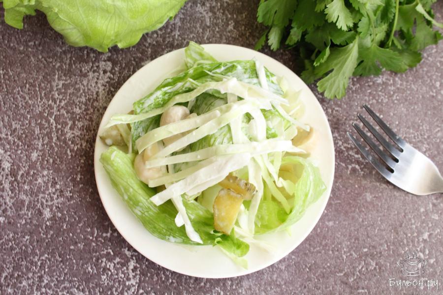 Быстрый капустный салат с айсбергом, шампиньонами и огурцами - готовится действительно за считанные минуты и очень просто. Салат получается легкий, сочный, хрустящий и вкусный. Если вы не употребляете майонез, то можно заправить салат ароматным, растительным маслом или не очень жирной сметаной. Огурцы для такого салата можно взять соленые, квашеные, свежие, попробуйте приготовить разные варианты. Салат можно дополнить мелко нарезанной зеленью.