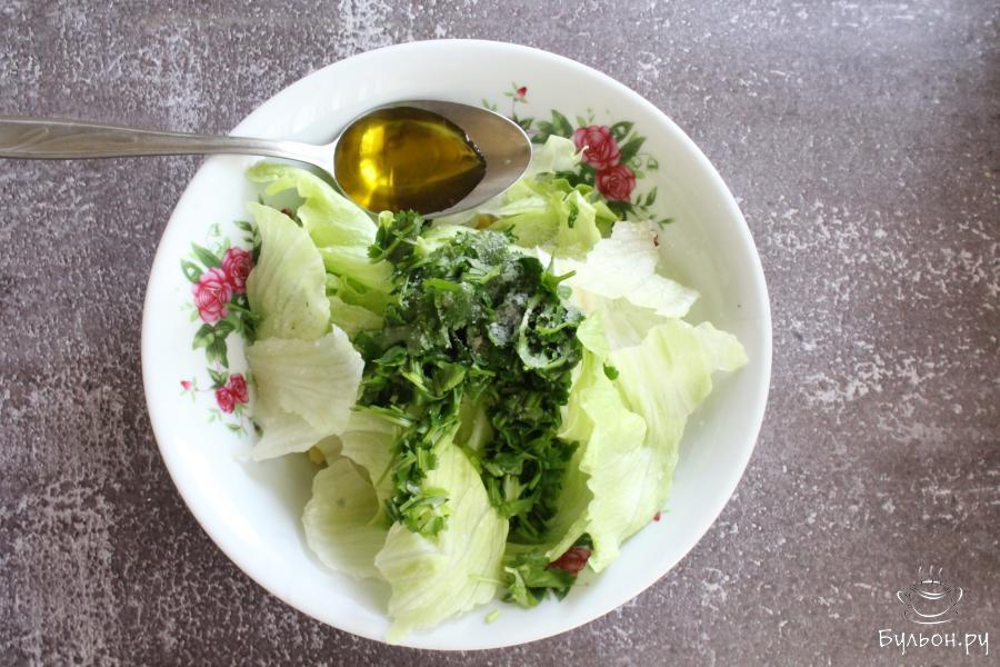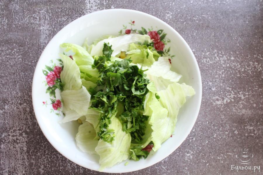 3. Листья салата и кинзу промыть, обсушить. Салат порвать руками на крупные кусочки, кинзу нарезать.