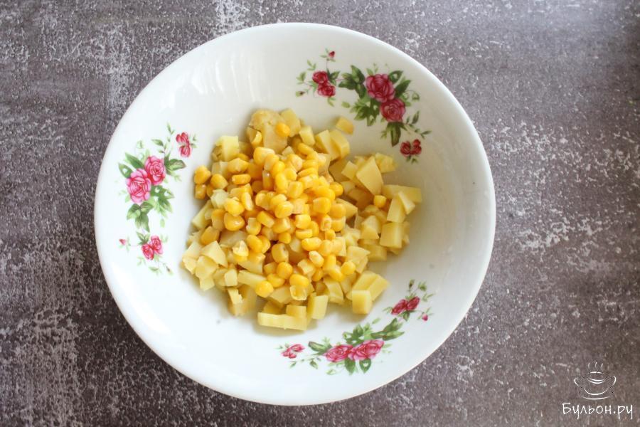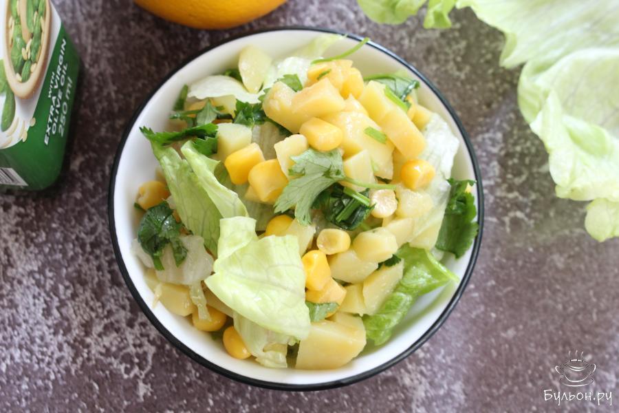 Картофельный салат с кукурузой и листьями салата готовится быстро, просто и из доступных продуктов. Такой салат можно приготовить к повседневному столу или предложить для вегетарианского и постного меню. Салат получается насыщенный, сочный, вкусный и яркий. Такой салат можно дополнить любой мелко нарезанной зеленью, которую вы любите. Подавать салат к столу желательно сразу, чтобы листья салата не успели потерять упругость.