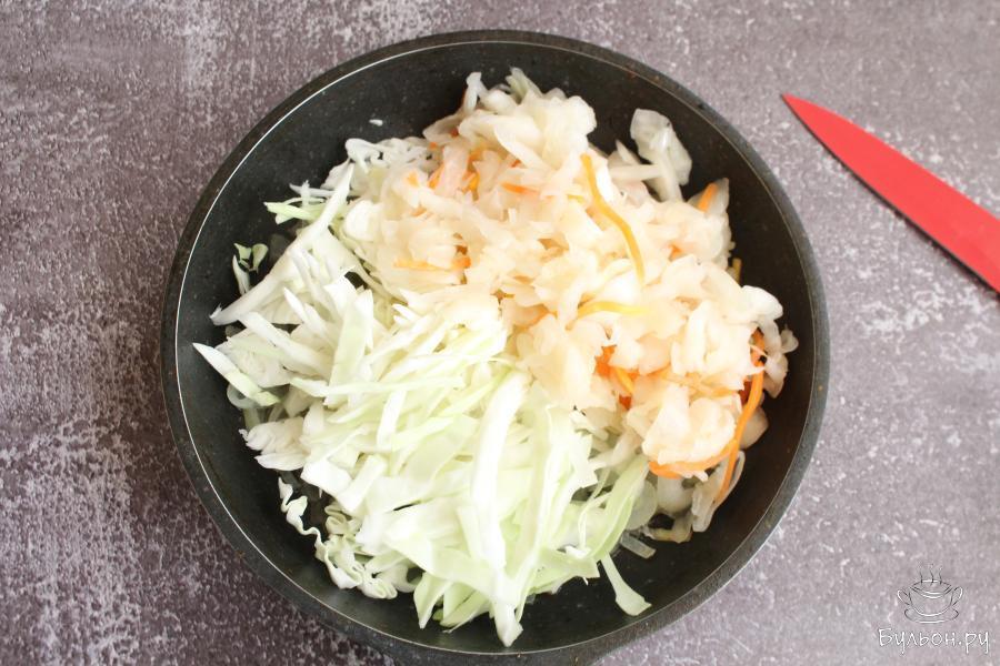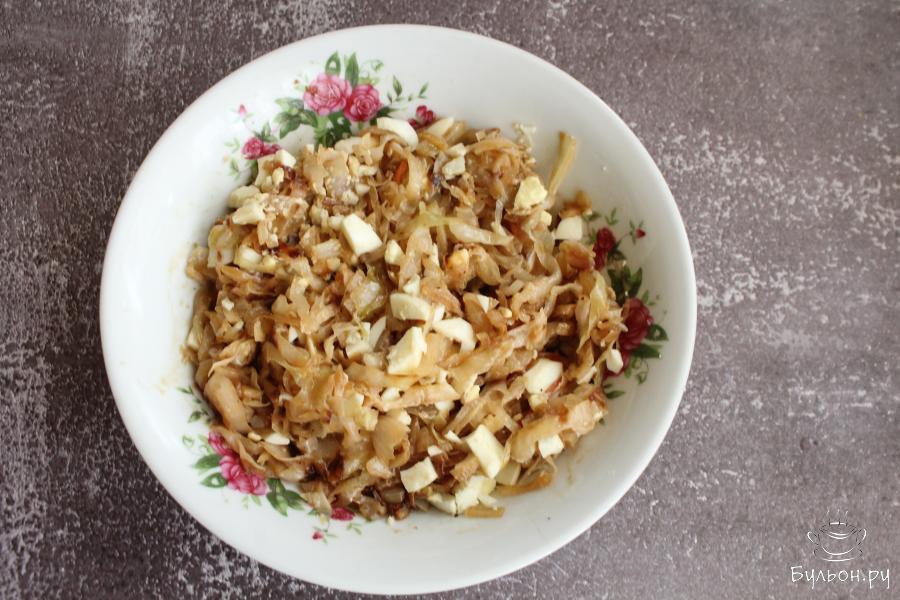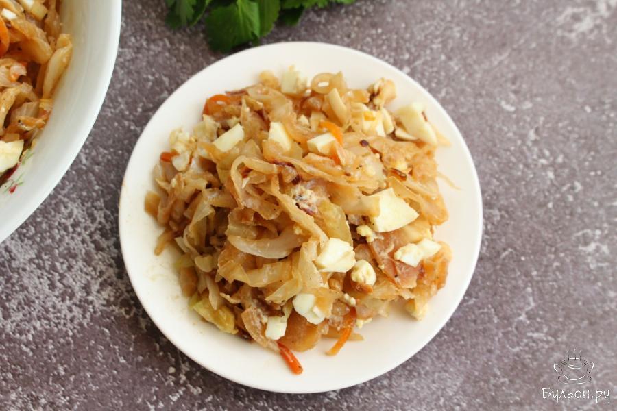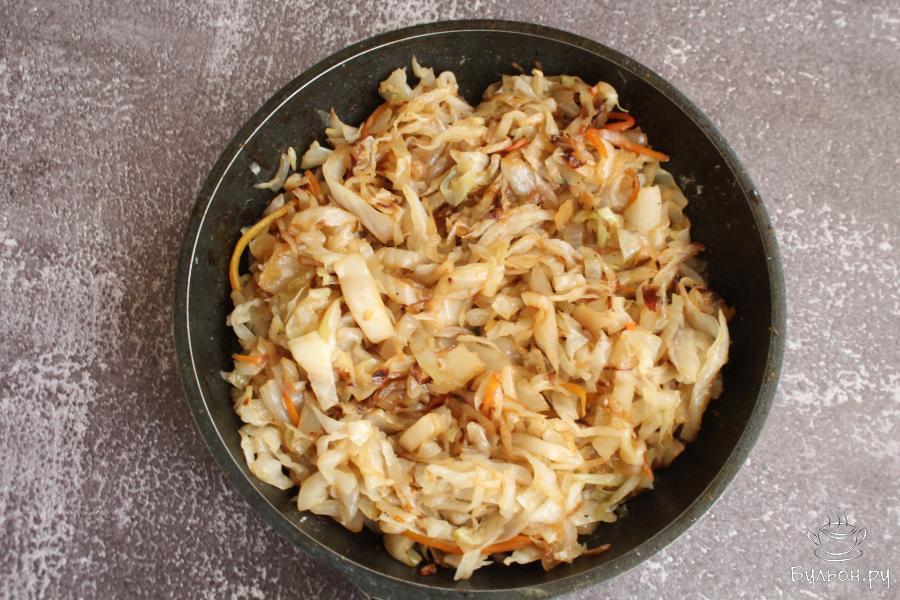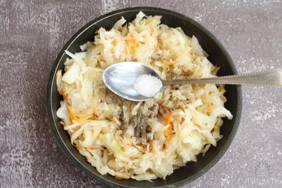 3. Тушить капусту на среднем огне, до нужной мягкости. Добавить в начинку перец, сахар, соль по вкусу.