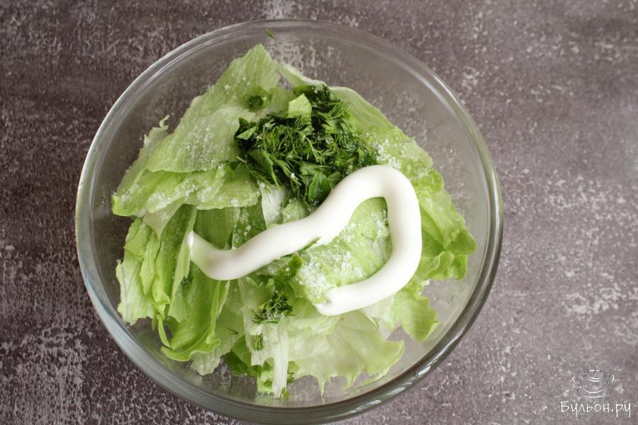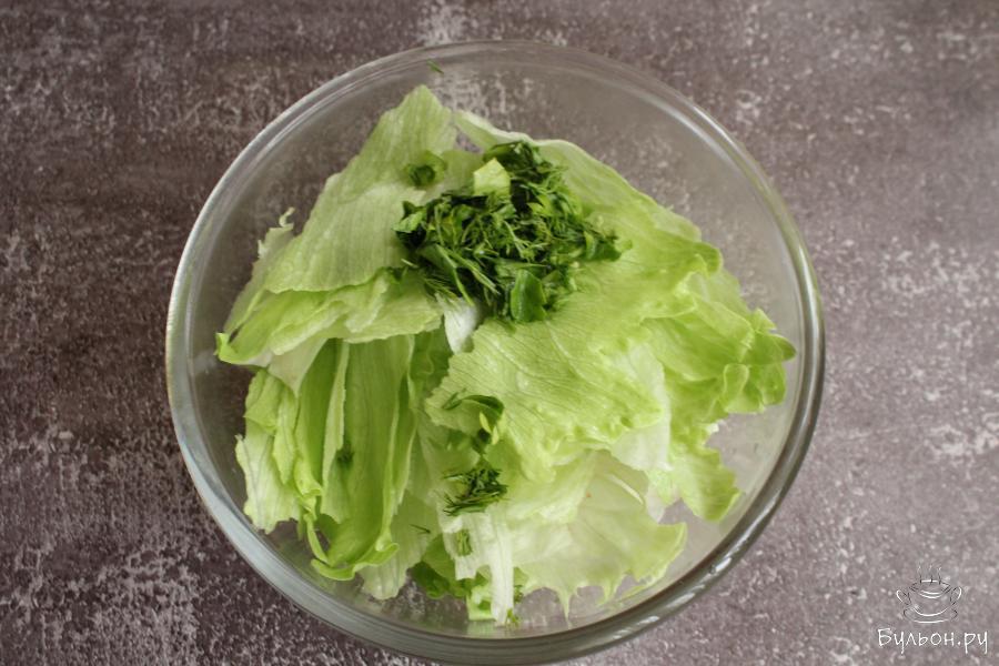 3. Листья салата и кинзу промыть обсушить. Салат порвать руками на крупные кусочки, кинзу мелко нарезать.