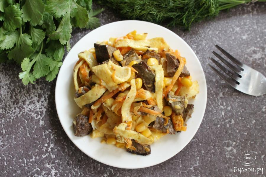 Салат с жареной говяжьей печенью и кукурузой, можно предложить как салат, но вполне можно порцией такого салата заменить полноценный обед или ужин. Салат получается очень сытный, насыщенный, вкусный и сочный. Готовится салат не очень быстро, но результат того стоит. Если вы не любите жареную морковь, то в такой салат вполне можно добавить морковь по-корейски. Все ингредиенты можно увеличить или уменьшить по вкусу, добавить больше кукурузы, печени, морковки или, наоборот, меньше.