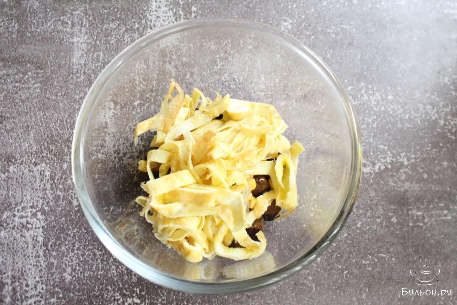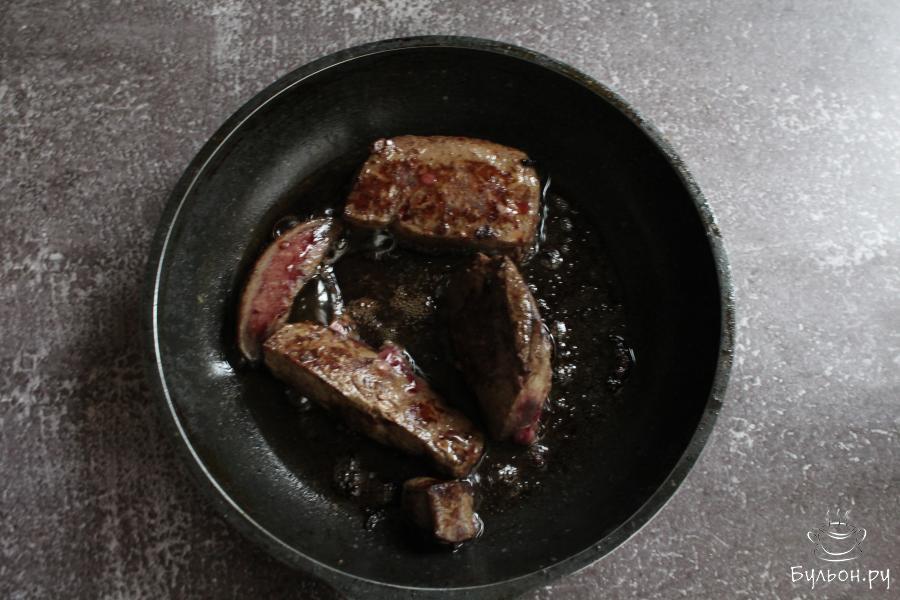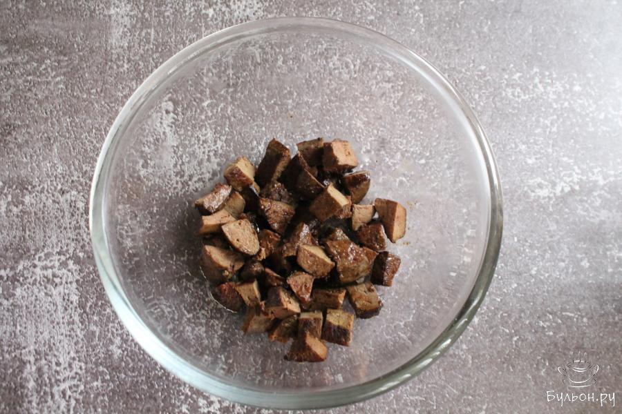 1. Печень промыть, снять пленки, нарезать печень не очень мелко. На сковороде разогреть половину масла и обжарить печень до готовности на небольшом огне. Сок из кусочков печени должен выходить прозрачный, значит она готова.