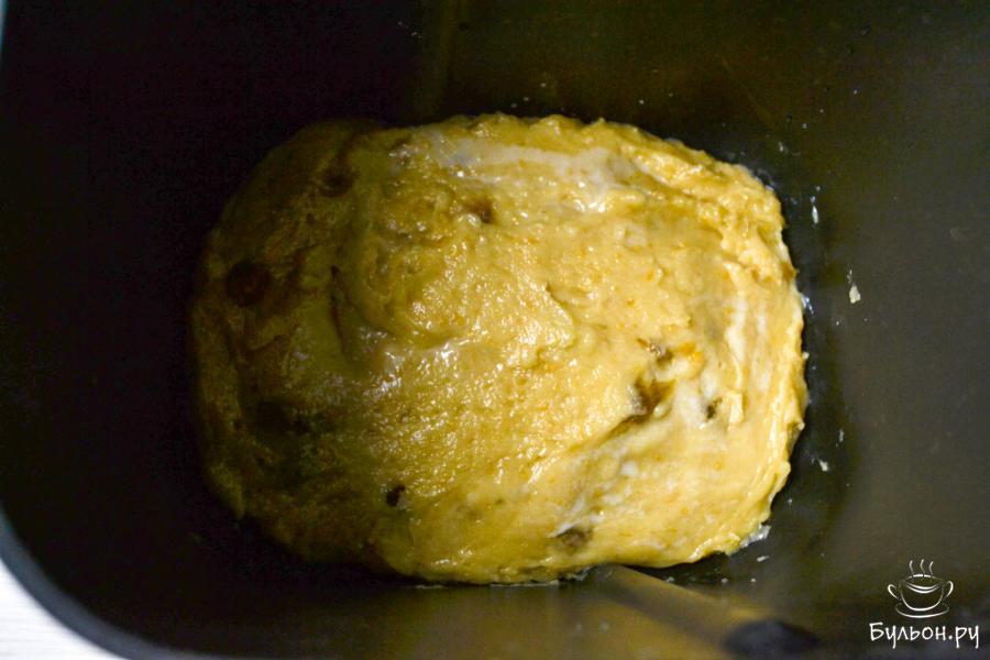 5. Переложите тесто в ведерко хлебопечки, предварительно уберите лопатку для замешивания теста. Поставьте ведерко в хлебопечь. Закройте крышку, выставите режим "Выпечка" на 1 час.
