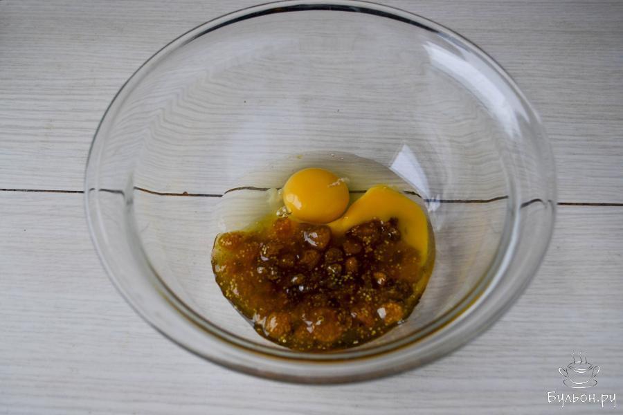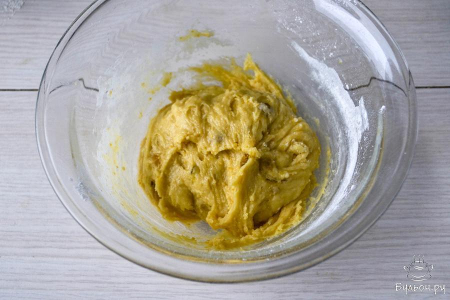 4. Перемешайте. Должно получиться густое тесто. Количество муки приблизительное. Будет зависеть от густоты варенья и категории яиц.