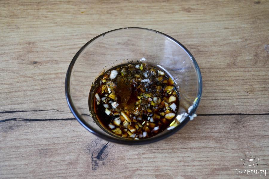 5. Заправка из соевого соуса, растительного масла, измельченного чеснока, сахара, черного перца и лимонного сока. Перемешайте все ингредиенты.