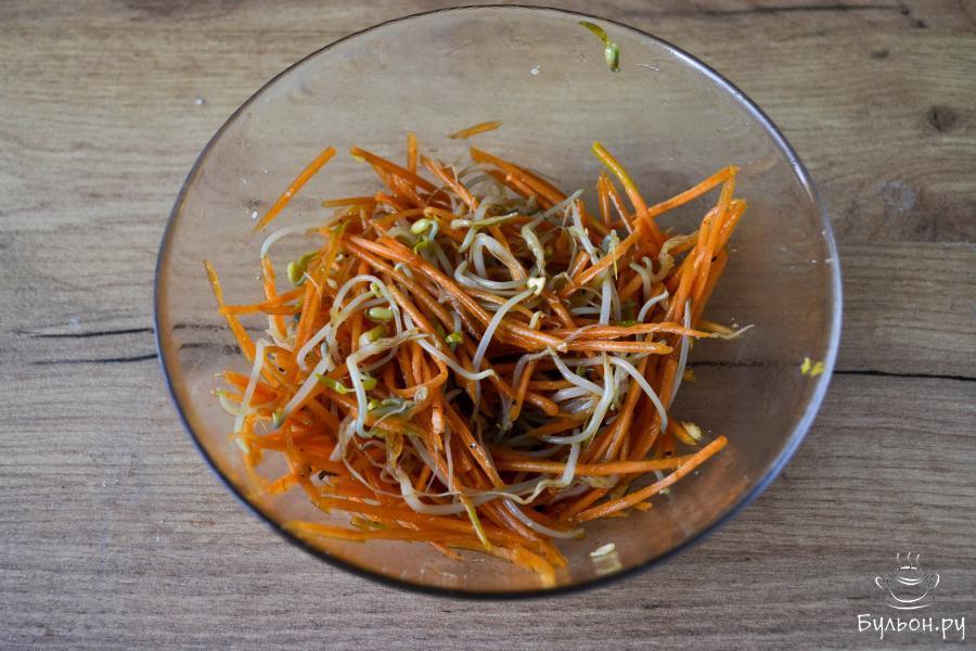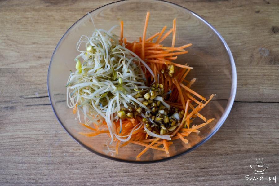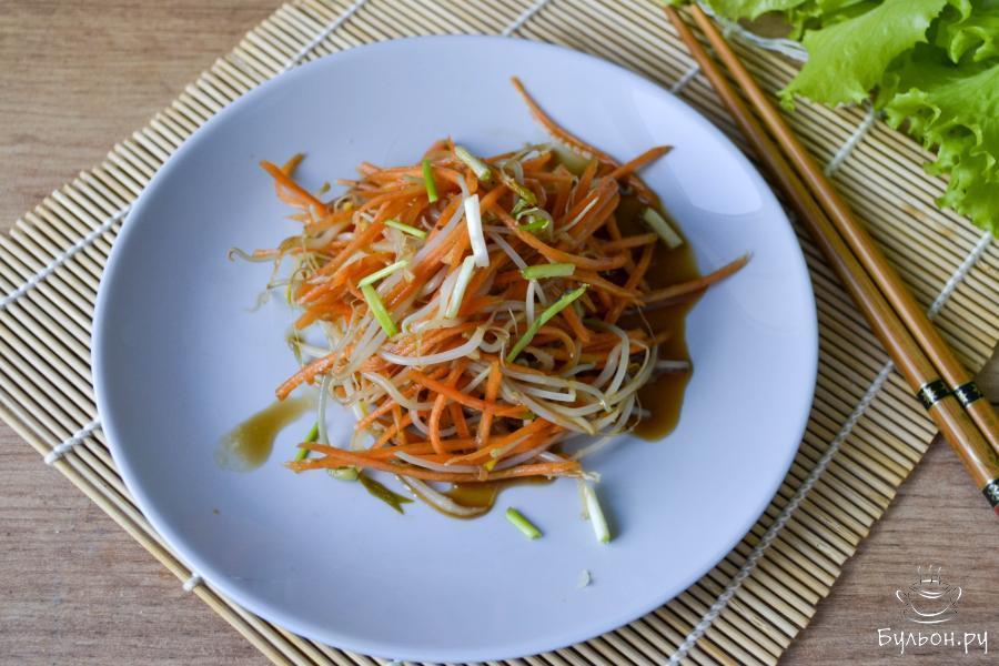 Зимой и весной нашему организму не хватает свежей зелени, овощей и фруктов. Поэтому проростки маша или, как его еще называют, бобы мунг, или ростки фасоли, будут как нельзя кстати. В проростках в концентрированном виде содержатся все полезные вещества растения и пользы в них больше, чем в зеленой массе. Сегодня приготовлю салат в азиатском стиле. Заправка для салата будет из соевого соуса и растительного масла, плюс чеснок и перец. К проросткам можно добавить не только морковь, но и свежий огурец, перья зеленого лука, петрушку, кинзу. В любом случае получается очень вкусный, пикантный, полезный салат.