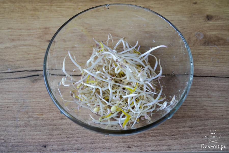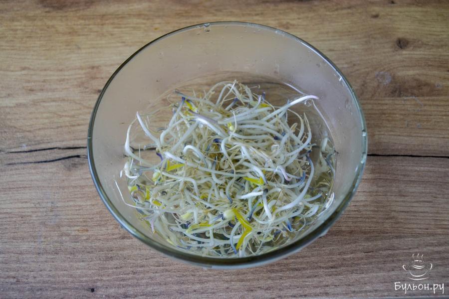 3. Вскипятите чайник и залейте крутым кипятком проростки. Прикройте миску тарелкой и оставьте проростки прогреваться на 2 минуты.