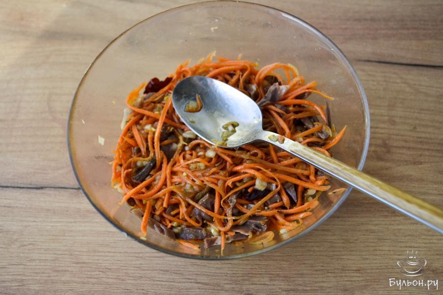 6. Добавьте соевый соус и перемешайте салат. Ложкой уплотните и поставьте в холодильник хотя бы на 1-2 часа. За это время салат пропитается, вкус его будет более ярким и насыщенным.
