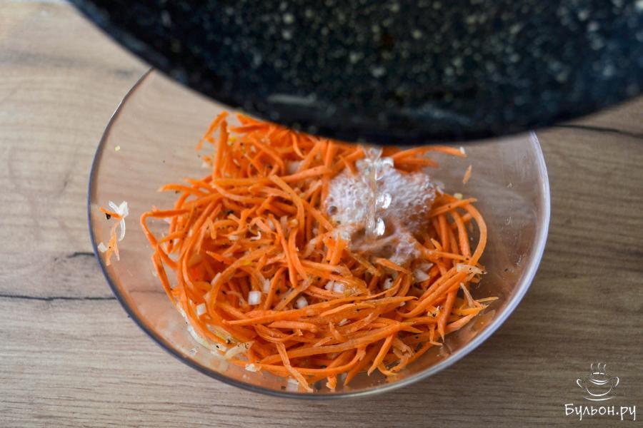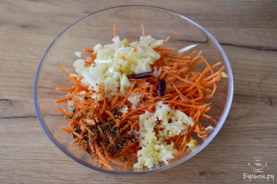 3. В миску с натертой морковью положите измельченный чеснок, мелко нарезанный лук, черный молотый перец и острый красный перец по вкусу. Перемешайте.