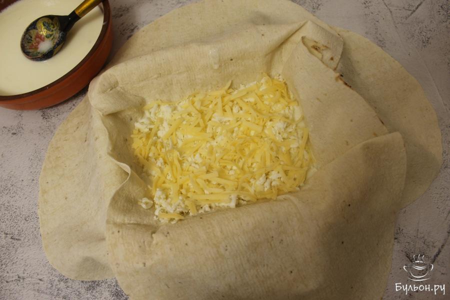 2. Дно формы для запекания выстелить лавашем крестообразно так, чтобы лаваш свисал по краям. На дно влейте 1/4 часть яично-кефирной заливки.