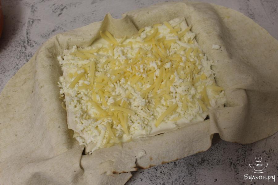 4. Накройте начинку одной частью свисающего лаваша, сделайте еще 1 слой такой начинки. Снова накройте начинку противоположной частью свисающего лаваша и снова уложите начинку.