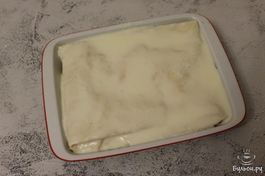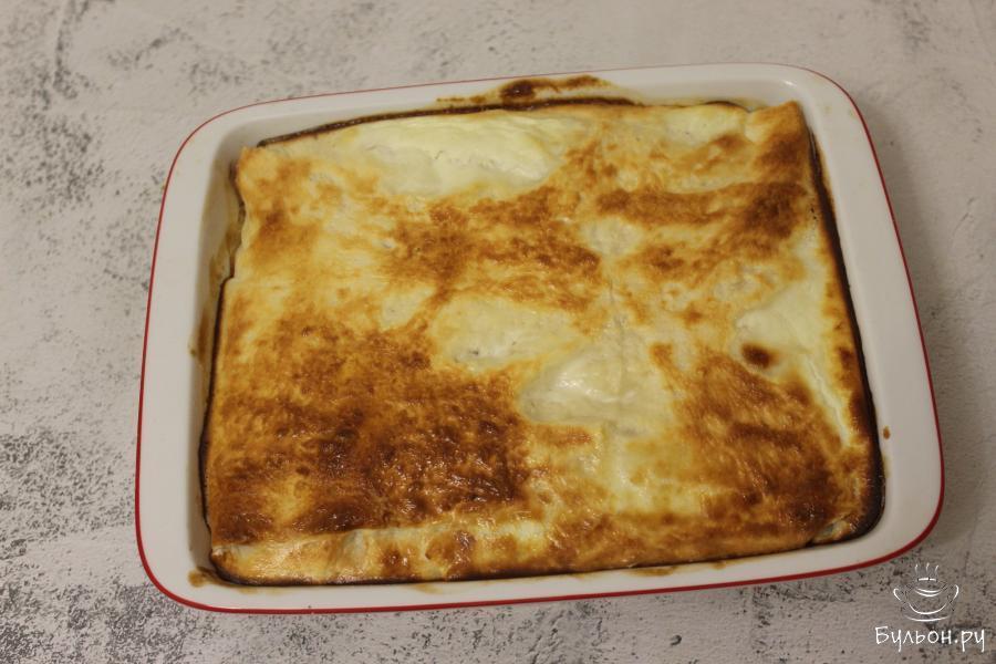 5. Последний слой начинки накройте двумя свисающими краями лаваша. Сверху ачму залейте оставшейся яично-кефирной заливкой.