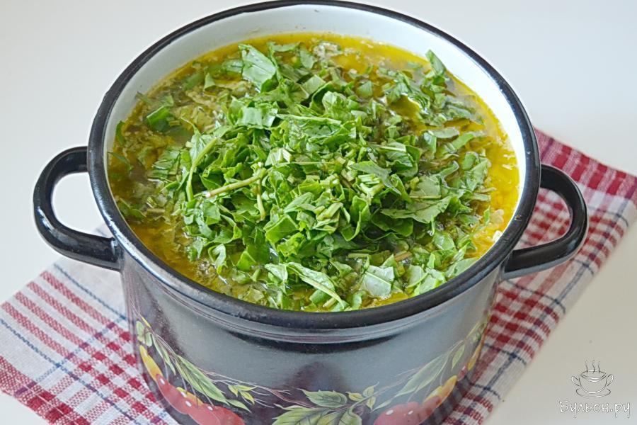10. Щавель в борщ добавим в самом конце, когда все ингредиенты уже будут готовы - мясо будет мягким и картошка сварится.