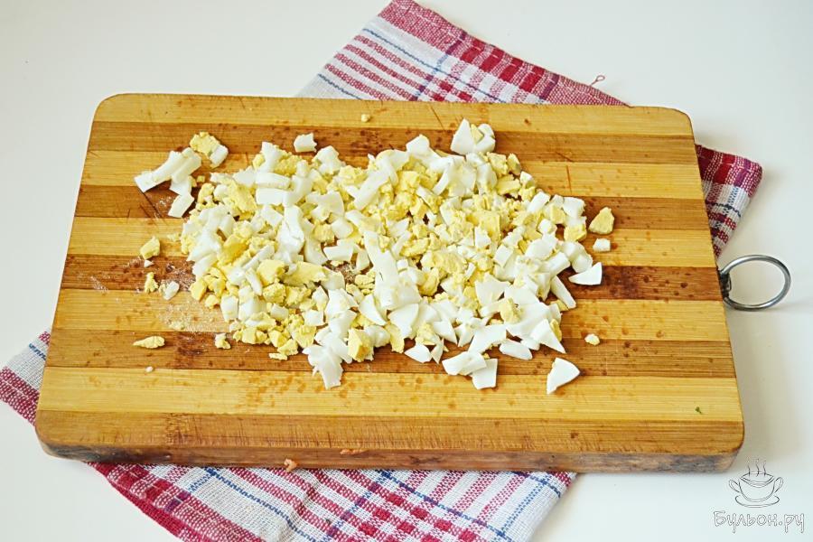 8. Яички сварим вкрутую, выдержим их после варки в холодной воде, после чего почистим и меленько нарежем.