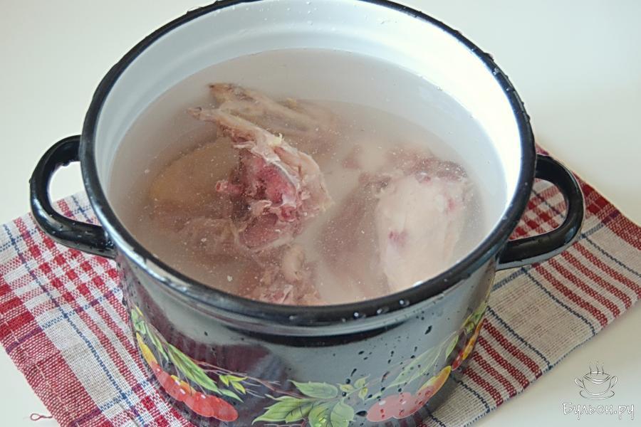 2. Положим кусочки в кастрюлю, зальем водой и поставим вариться примерно на час. Пену снимем, посолим.
