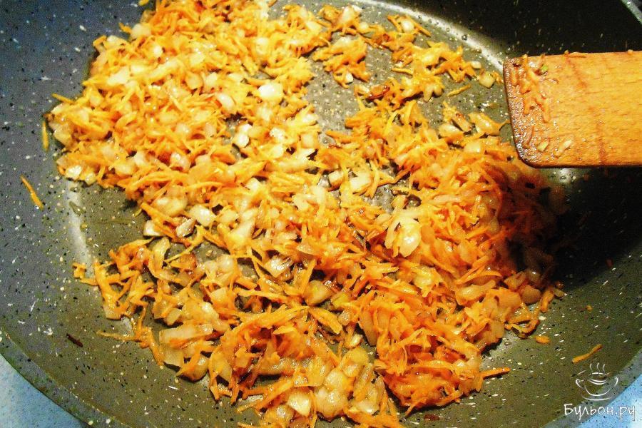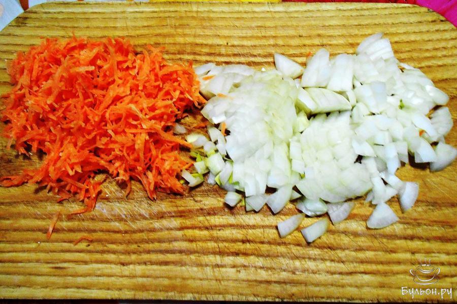 5. Луковицу и морковку почистить от кожуры и помыть. Морковку натереть на средней терке, луковицу мелко порезать.