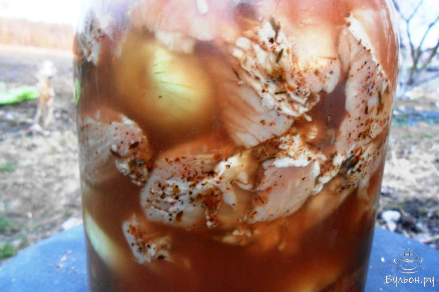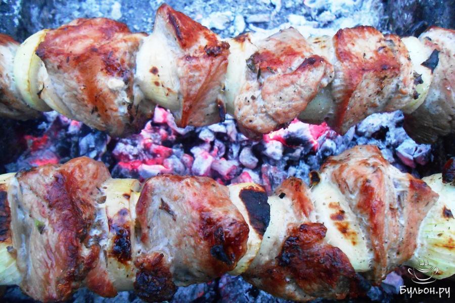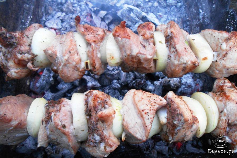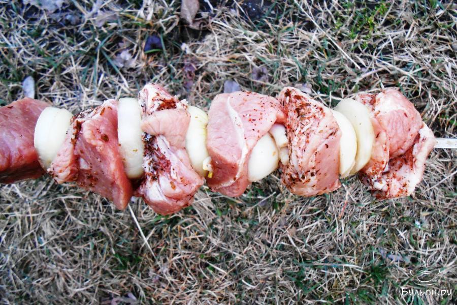 1. Свинину нужно порезать крупными кусочками, луковицу порезать кольцами и замариновать на сутки в воде и вине, добавить приправку для шашлыка, посолить и поперчить.