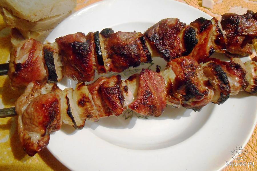 Сочный и ароматный свиной шашлык в вине. Вино для маринада использовали домашнее натуральное, для шашлыка выбрали свиную лопатку. Жарить на углях с хорошим жаром, но если появится огонь нужно немедленно потушить, чтобы мясо не подгорело. В процессе жарки постоянно нужно переворачивать шампура, чтобы мясо равномерно прожарилось. И поливать маринадом из красного вина, в котором мясо мариновалось, чтобы мясо не было сухим. Подавать шашлык в вине горячим лучше с овощами и ломтиками хлеба.