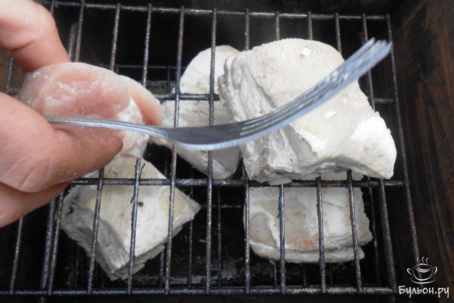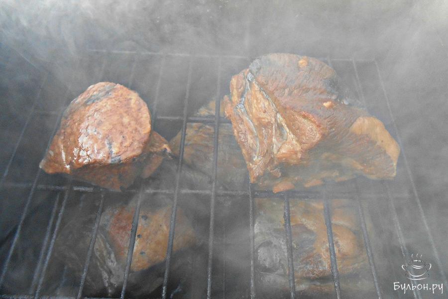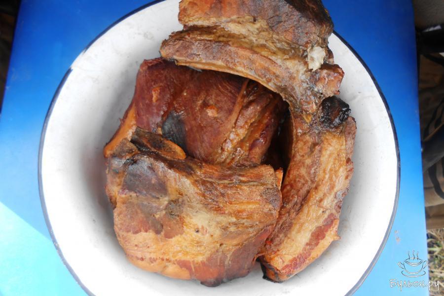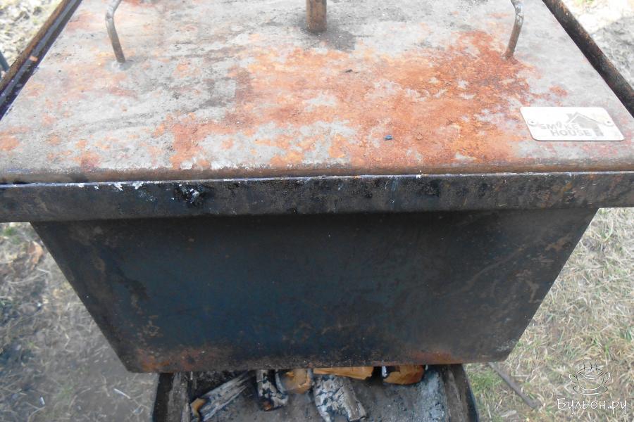 6. На дно коптильни уложить опилки, поставить решетку с грудинкой, закрыть коптильню и поставить на костер.