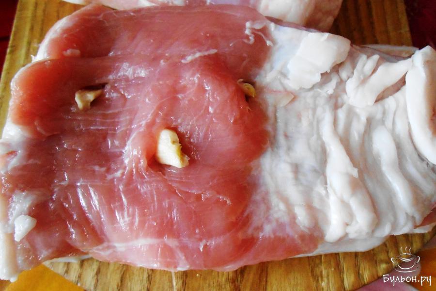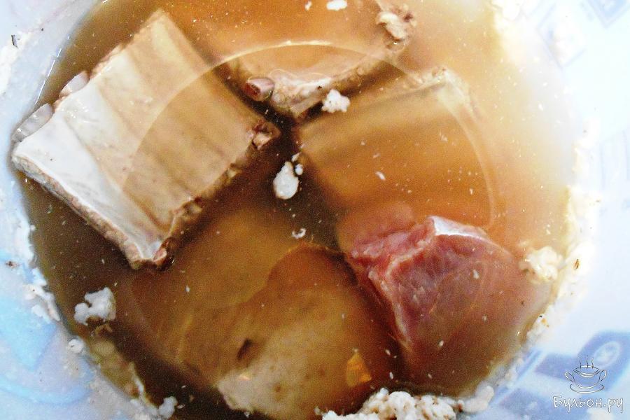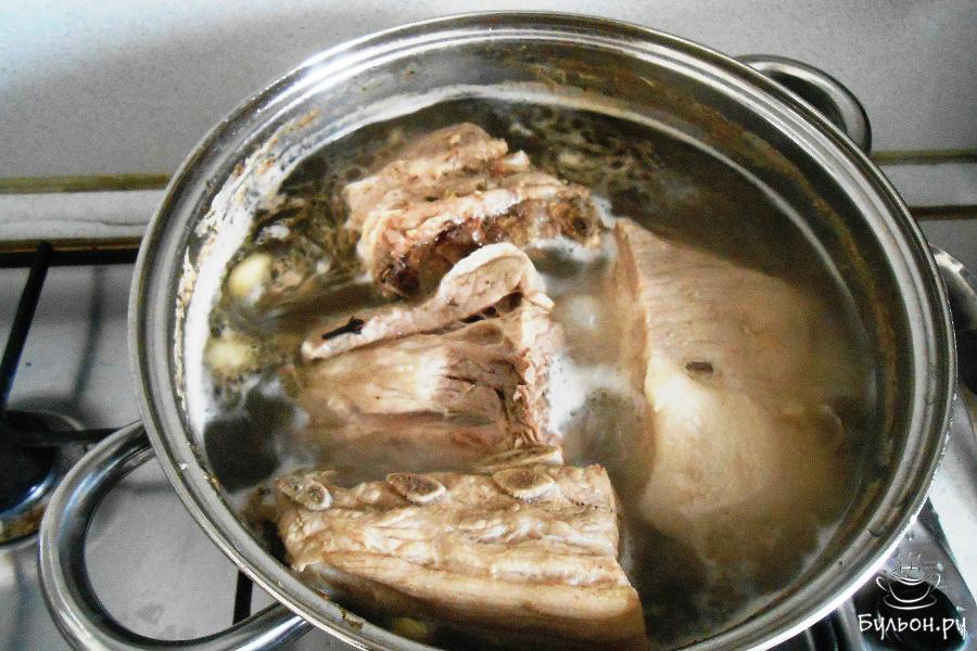 3. Грудинку вместе с бульоном остудить и оставить мариноваться в бульоне, в котором грудинка варилась, на сутки.