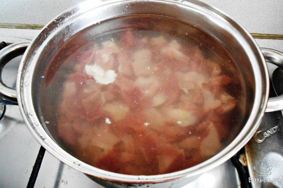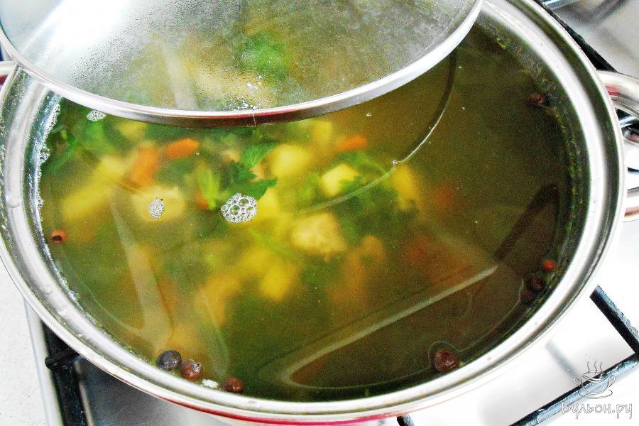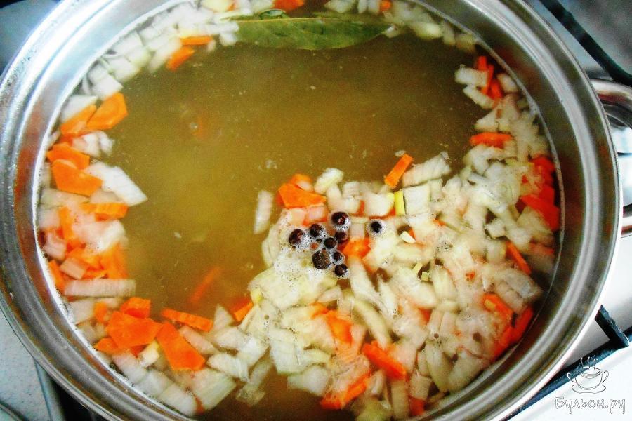 6. Добавляем в бульон лавровый лист, перец горошком, солим и варим до тех пор, когда картофель будет готов.