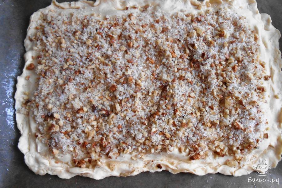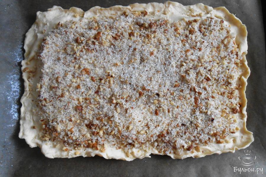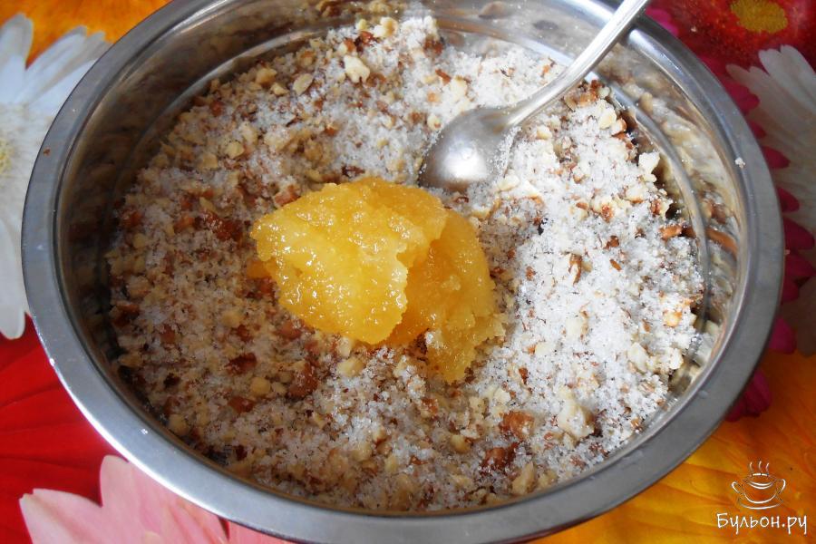 5. Тем временем готовим начинку. Измельчаем 2 стакана грецких орехов при помощи скалки или блендера.