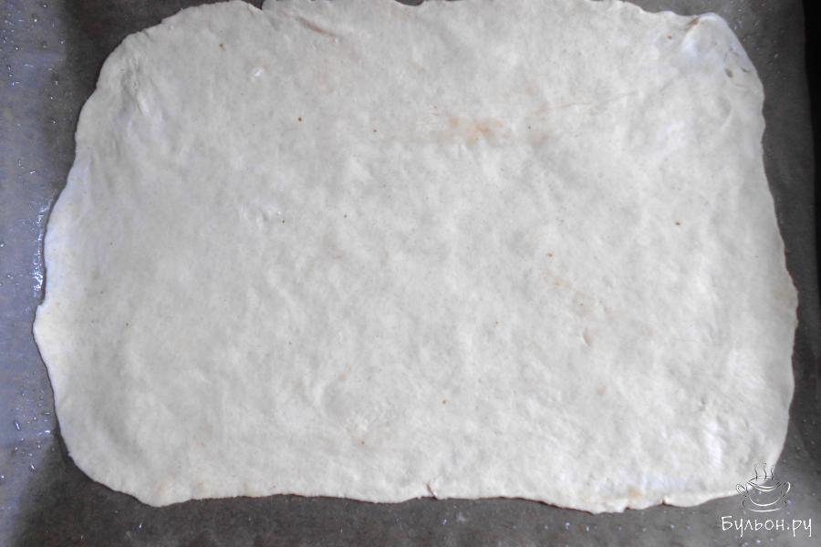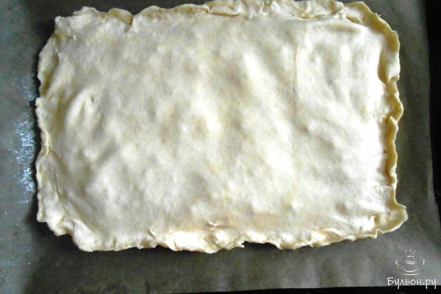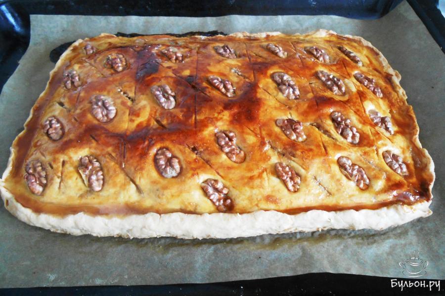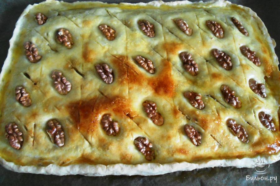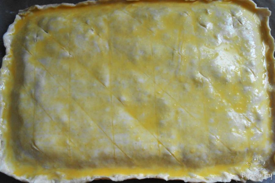 14. И закрываем последней раскатанной частью теста. Делаем ножом насечки в виде ромбиков, не прорезая тесто, и смазываем взбитым яйцом.