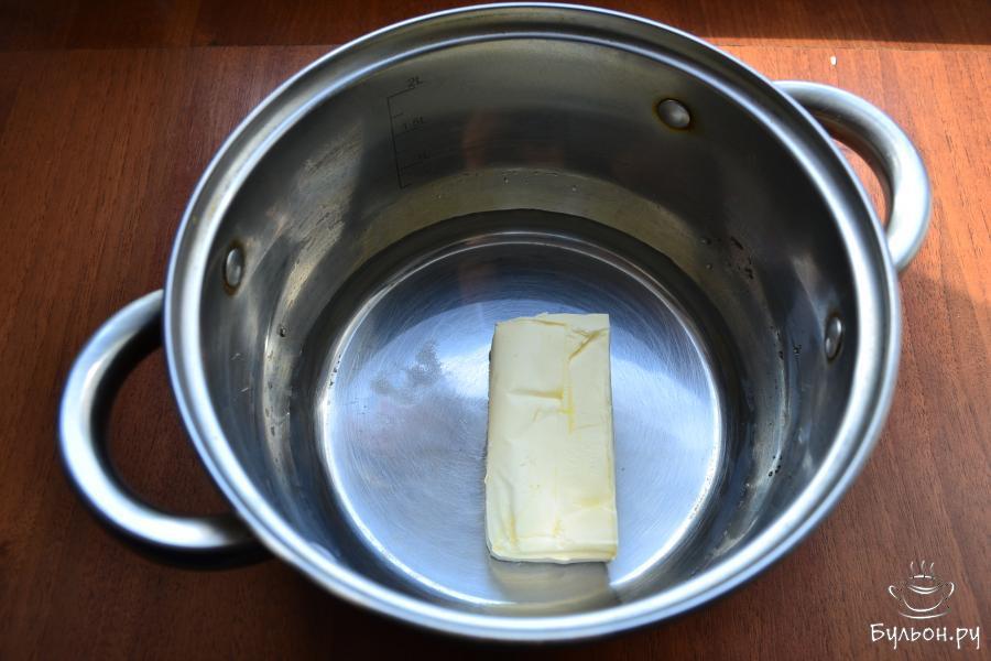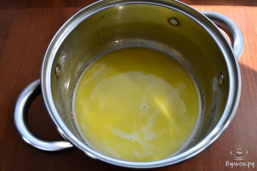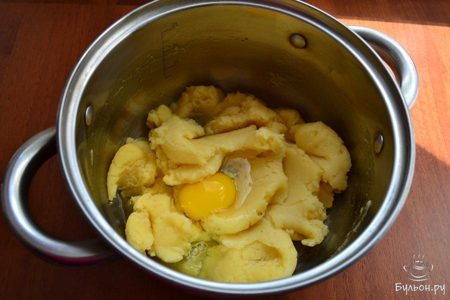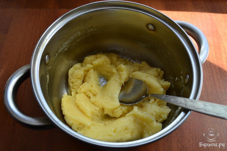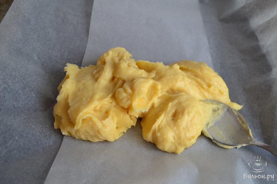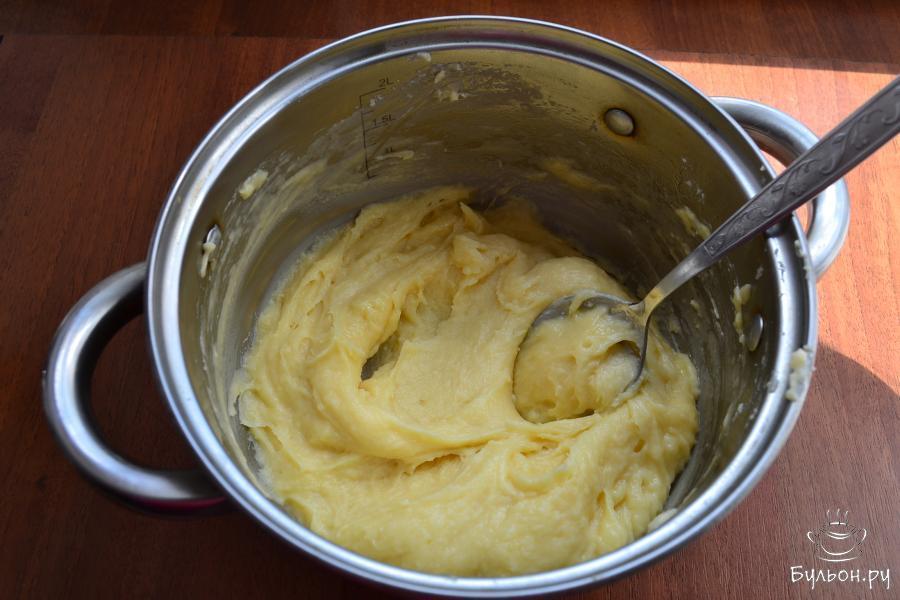 3. В горячую смесь всыпать муку и быстро замесить ложкой заварное тесто. Остудить тесто до теплого состояния.