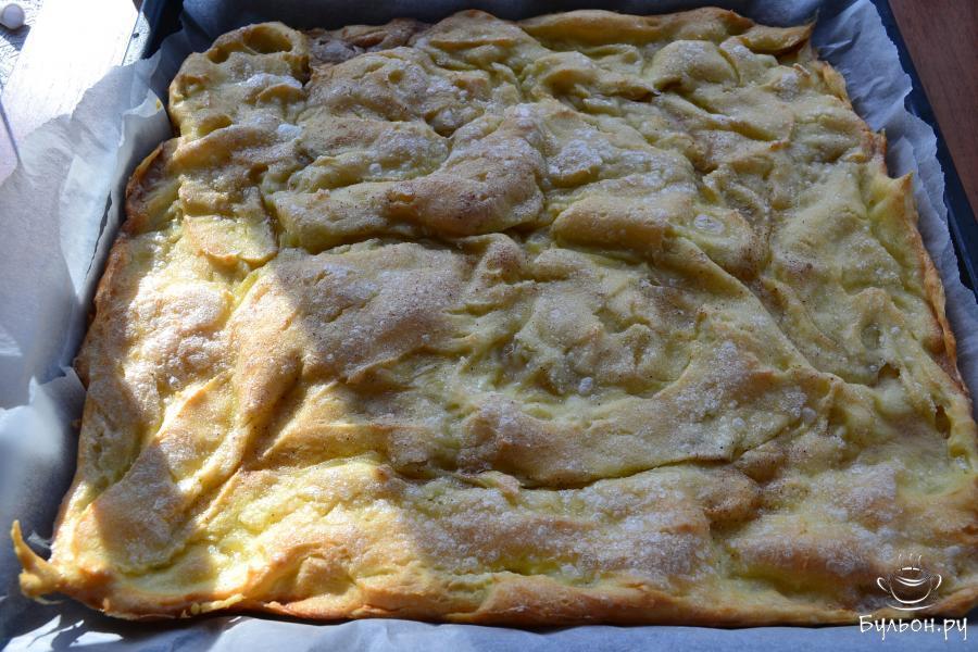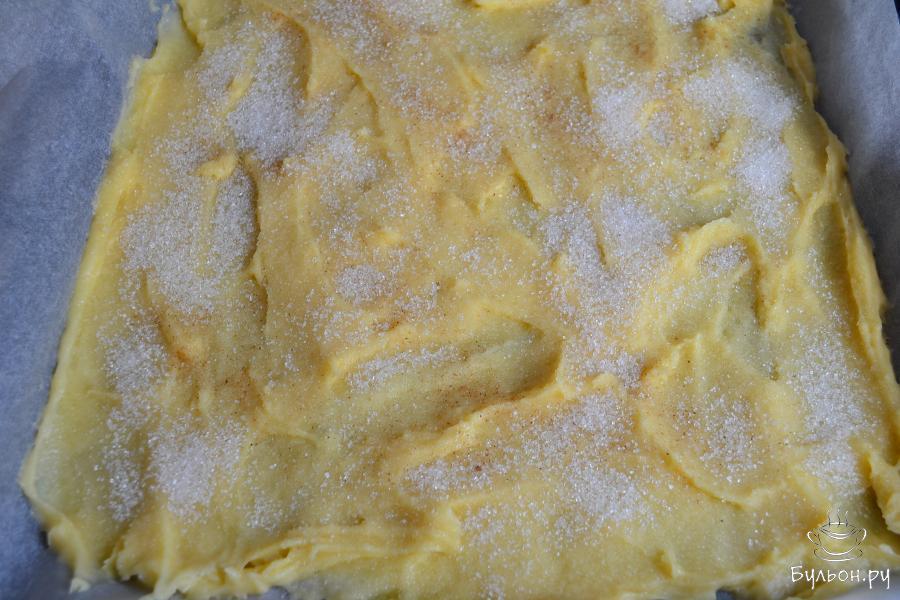 6. Противень застелить пергаментом и выложить тесто. Ложкой размазать тесто по диаметру всего противня в тонкую лепешку.