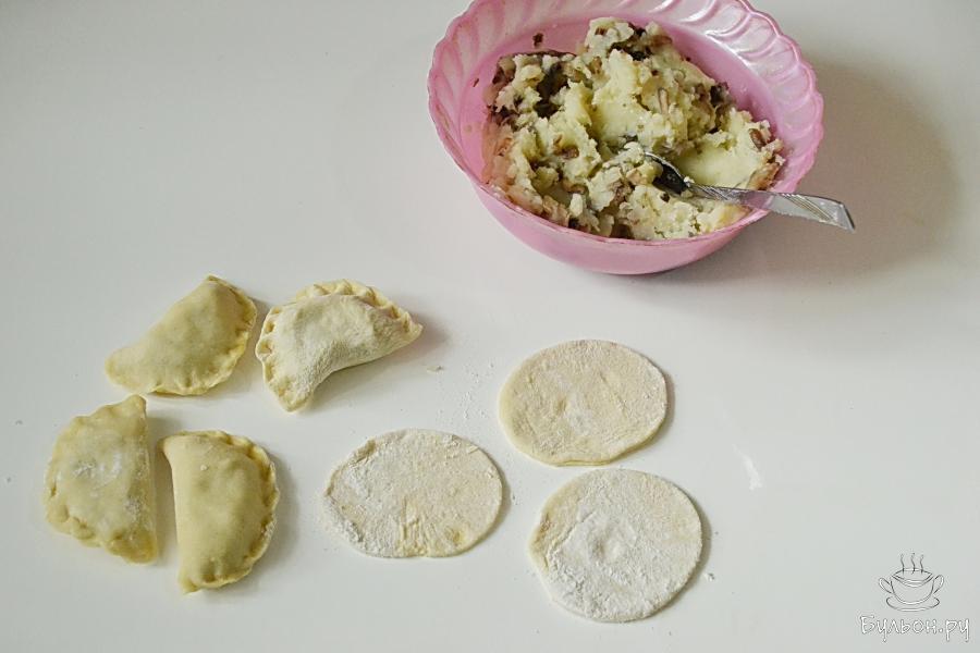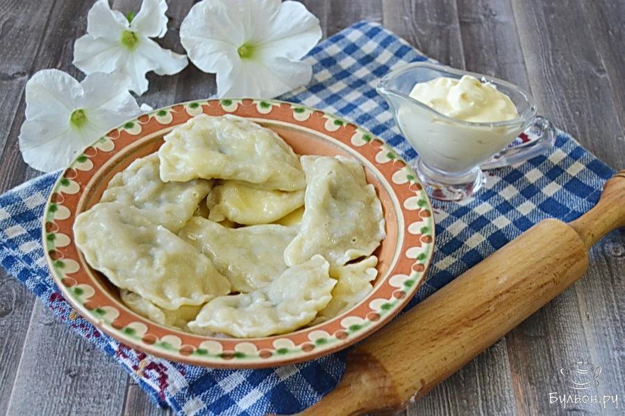 12. Готовые вареники отварим в подсоленной воде и сразу же подадим. Вареники с картошкой и грибами можно кушать со сметаной, жареным луком, салом, грибной подливой, грибным соусом и так далее.