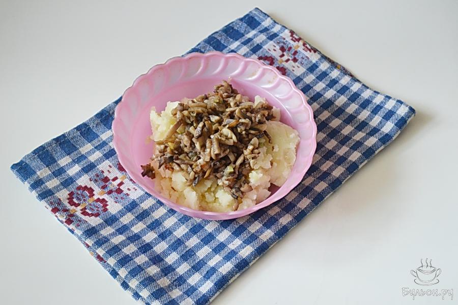 4. Мелко нарезанные шампиньоны поджарим на подсолнечном масле, немного посолив, вместе с репчатым луком.