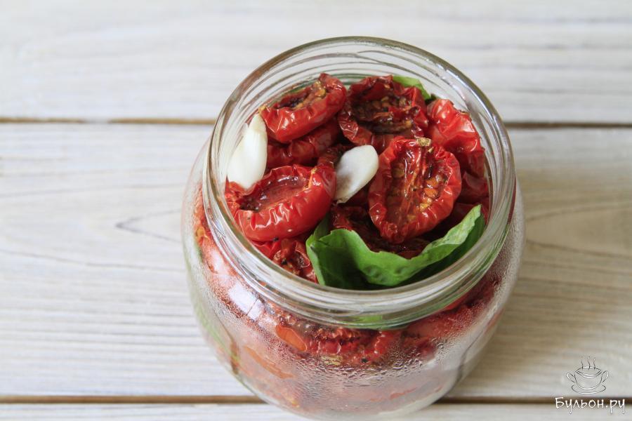 6. Банки промыть и хорошо обсушить. На дно уложить листочки базилика, дольки чеснока и выложить несколько слоев вяленых томатов. Повторить данную процедуру до полного заполнения. Влить 2 столовые ложки оливкового масла и закрыть банку крышкой. Вяленые томаты с базликом в масле готовы к употреблению.