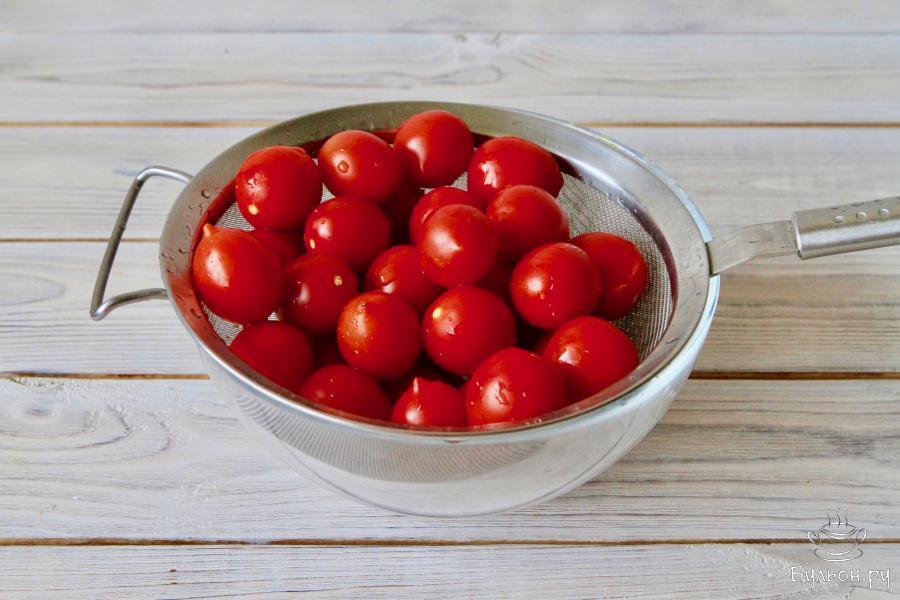 1. Первым делом необходимо выбрать хорошие томаты. Для приготовления отлично подходят помидоры черри. Плоды должны быть спелые, небольшого размера и желательно сладкими.