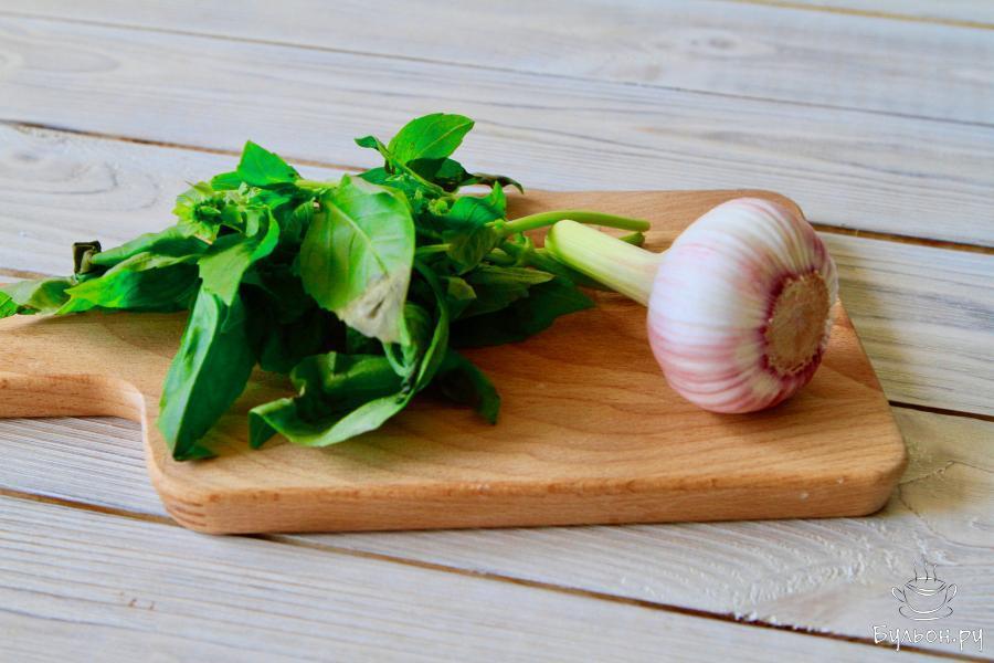 5. Подготовить базилик и чеснок. Листья базилика промыть и обсушить, а дольки чеснока разрезать пополам.
