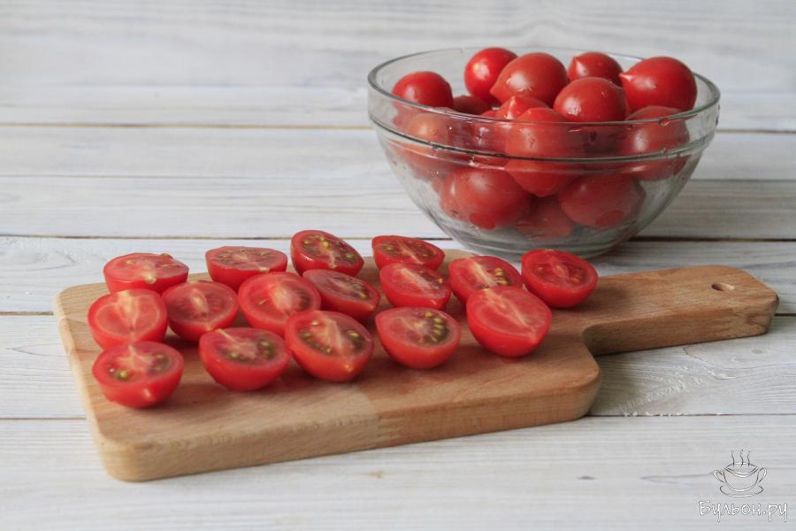 2. Помидоры удалить от подножек, тщательно промыть, обсушить и разрезать пополам. По этому рецепту середину из томатных долек не удаляют.