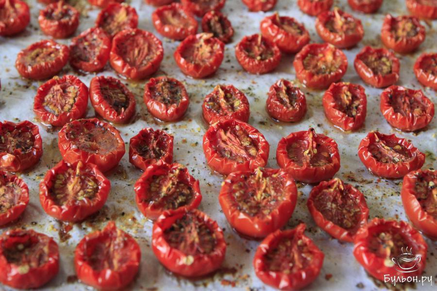 4. Помидоры отравить в духовку на 6 часов и готовить их при температуре 90 гр. Периодически доставать их и переворачивать лист, следить чтобы помидоры не подгорели и самое главное не пересушились. Готовые помидоры значительно уменьшаться в размере.