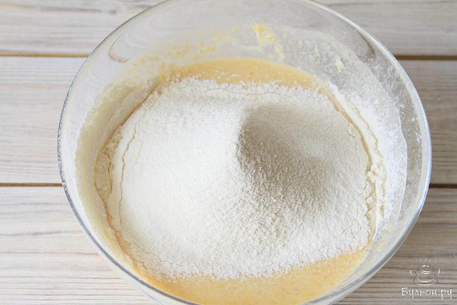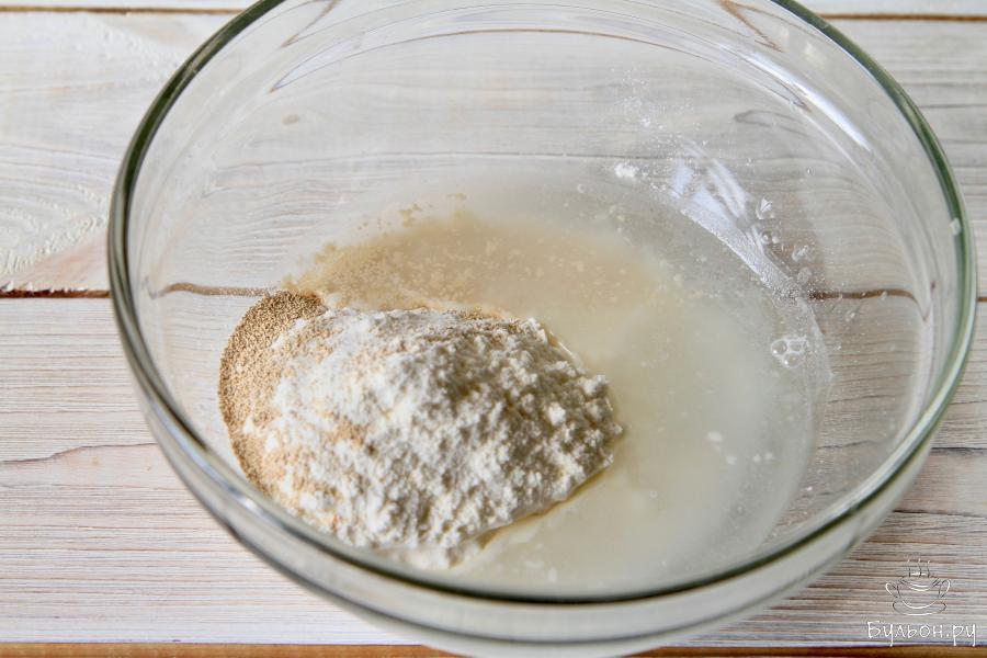 1. Начнем подготовку с опары. Для этого необходимо подготовить муку, воду, сухие дрожжи и сахар. В чашу просеять 100 гр муки, добавить 2 гр сахара, дрожжи и 100 мл теплой воды.
