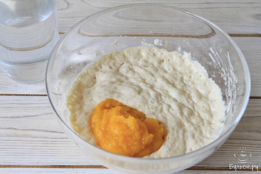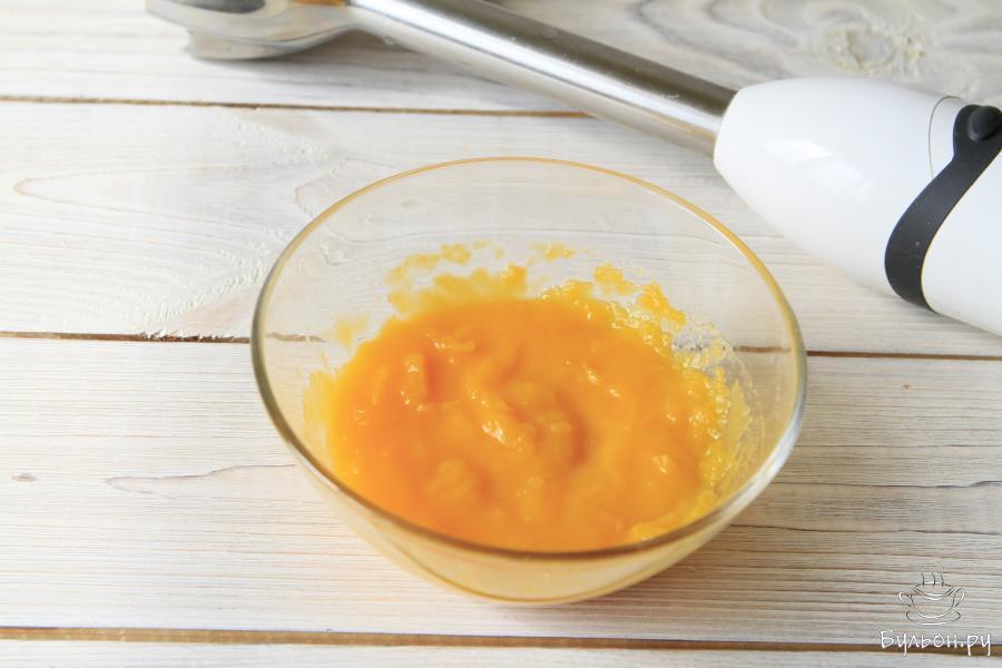5. Тыкву слегка остудить и переложить в небольшую чашу. Добавить сливочное масло и пробить блендером до пюре образного состояния. Тыквенное пюре остудить.