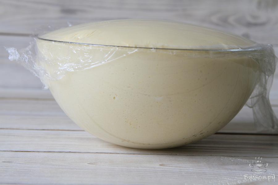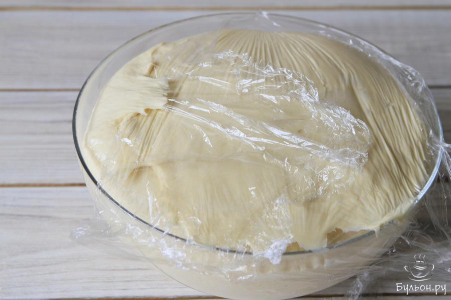 10. Добавить в тесто соль и хорошо его вымесить до однородной гладкой консистенции. Я вымешивала миксером в течение 15 минут. Чашу с тестом накрыть пищевой пленкой и оставить на 3 часа.
