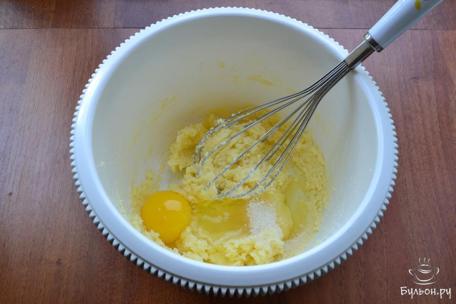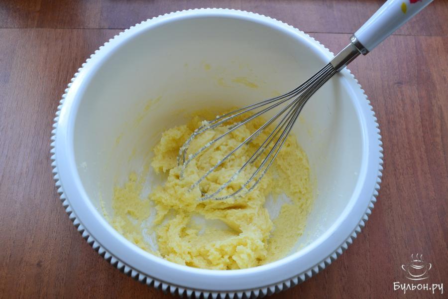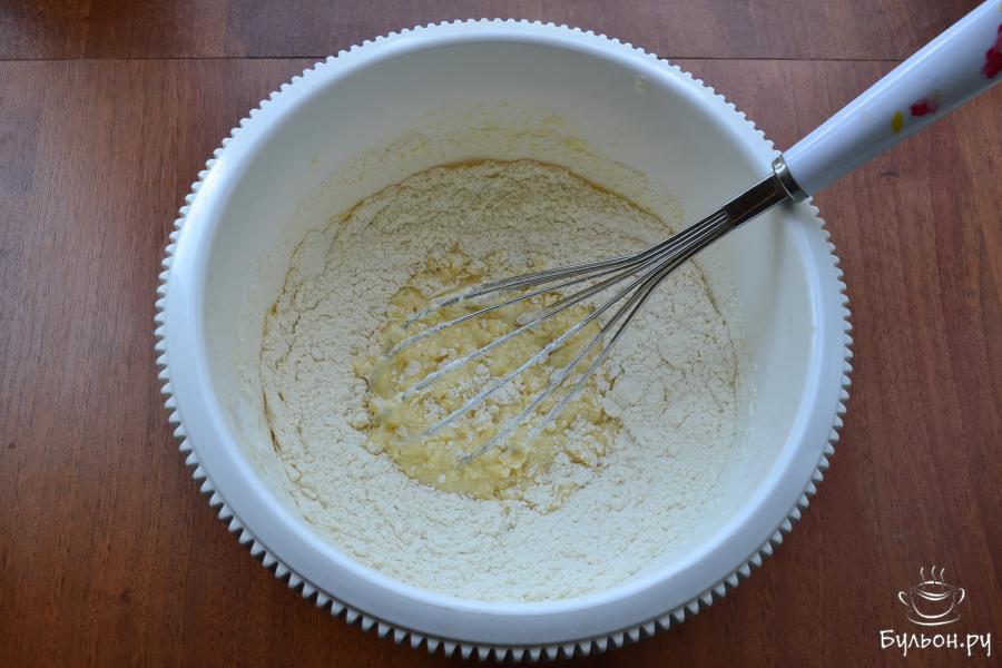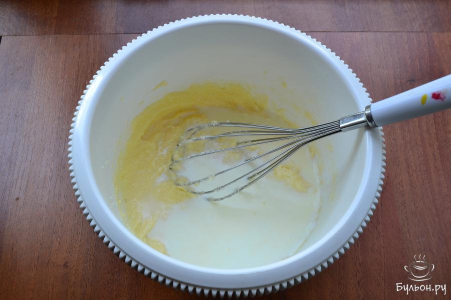 4. Влить молоко комнатной температуры и добавить щепотку соли, снова все хорошенько растереть венчиком.