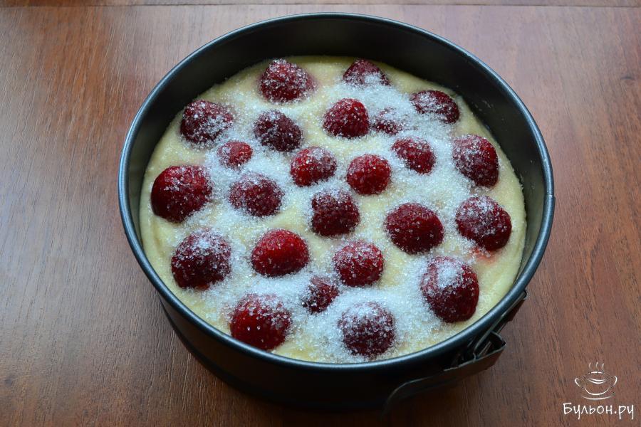 7. Форму разъемную диаметром 18-19 см застелить пергаментом, выложить подготовленное тесто. Сверху разместить ягоды клубники, посыпать оставшимся сахарным песком.